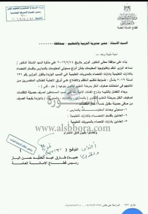 ارسلت وزارة التربية والتعليم والتعليم الفنى، خطابا مهما الى جميع المديريات التعليمية بشأن ادراج المسئولين عن إدخال المعلومات بالمدارس ومسئولي قسم الإحصاء بالإدارات والمسئولين بإدارة الإحصاء بالمديريات فى نسب المستحقين لصرف حصيلة التظلمات لصفوف النقل بمرحلة التعليم الثانوى.