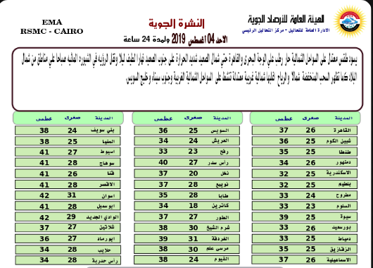 حذر خبراء هيئة الأرصاد الجوية،من ارتفاع درات الحرارة اليوم حيث من المتوقع أن يسود البلاد اليوم الأحد طقس معتدل على السواحل الشمالية حار رطب على الوجه البحرى والقاهرة حتى شمال الصعيد شديد الحرارة على جنوب الصعيد نهارًا لطيف ليلاً.