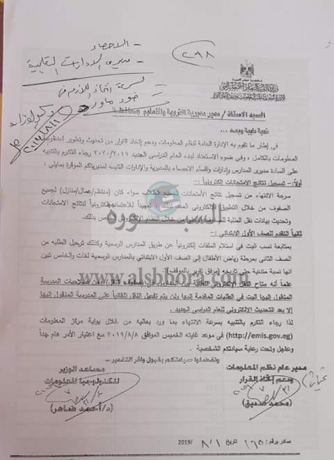 ارسلت وزارة التربية والتعليم والتعليم الفنى، خطابا مهما الى جميع مديرى المدارس على مستوى الجمهورية على ان يكون آخر موعد 8 اغسطس 2019.