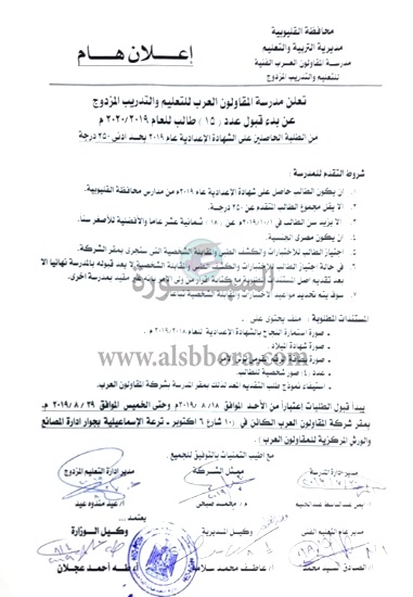 أعلنت مدرسة المقاولون العرب للتعليم والتدريب المزدوج عن بدء قبول 15 طالب للعام 2019/2020 من الطلبة الحاصلين على الشهادة الإعدادية بحد أدني 250 درجة.