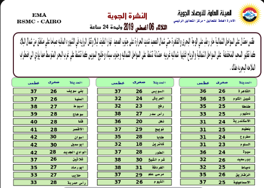 اعلن خبراء هيئة الأرصاد الجوية أنه من المتوقع ان يسود اليوم الثلاثاء، طقس معتدل على السواحل الشمالية حار رطب على الوجه البحري والقاهرة حتى شمال الصعيد، شديد الحرارة على جنوب الصعيد نهارا لطيف ليلا.