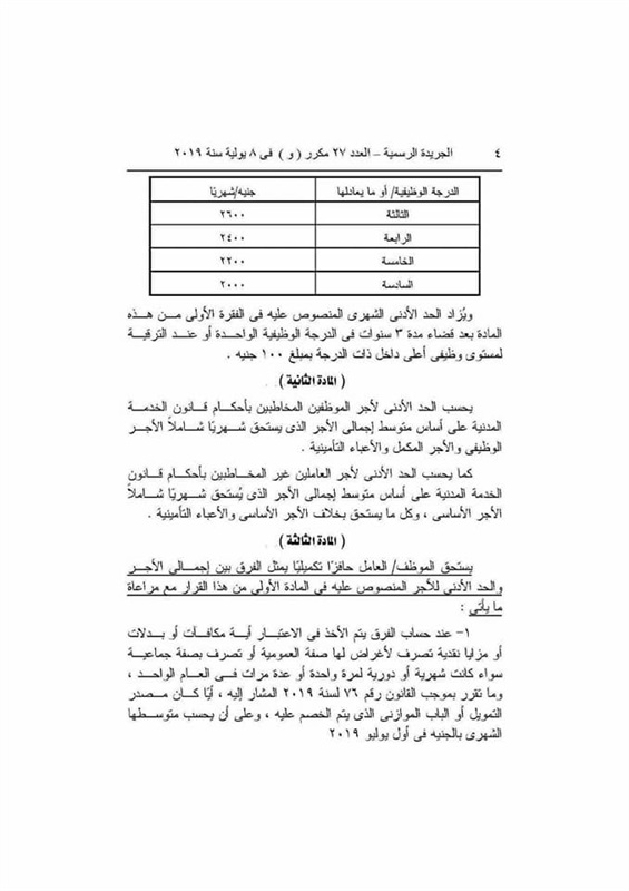 اصدر مجلس الوزارء قرار رقم 1627 لسنة 2019، بتقرير الحد الأدنى للأجور للموظفين والعاملين لدي أجهزة الدولة والهيئات العامة الاقتصادية وتم نشره في الجريده الرسمية.