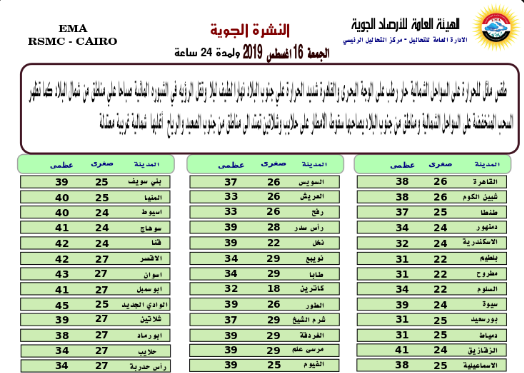اعلن خبراء هيئة الأرصاد الجوية، أنه من المتوقع ان تشهد درجات الحرارة انخافضا كبيرا حيث من المتوقع ان يسود غدًا الجمعة، طقس مائل للحرارة على السواحل الشمالية، حار رطب على الوجه البحرى والقاهرة، شديد الحرارة علي جنوب البلاد نهارا لطيف ليلا.