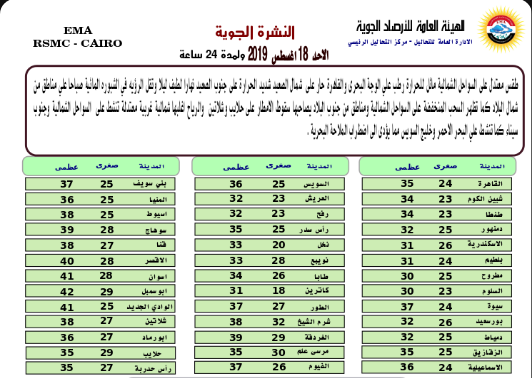 اكد خبراء هيئة الأرصاد الجوية، حدوث تغيرات طفيفة بطقس اليوم الاحد حيث يسود طقس اليوم الأحد معتدل على السواحل الشمالية، حار رطب على الوجه البحرى والقاهرة حتى شمال الصعيد، شديد الحرارة على باقى الأنحاء نهارا، لطيف ليلا.