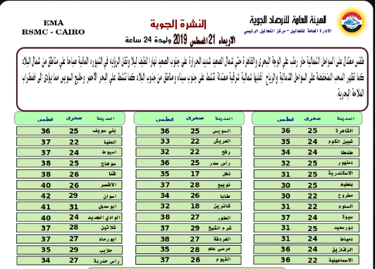 حذر خبراء هيئة الأرصاد الجوية من ارتفاع درجات الحرارة حيث من المتوقع ان يسود البلاد اليوم الأربعاء طقس معتدل على السواحل الشمالية حار رطب على الوجه البحرى والقاهرة حتى شمال الصعيد شديد الحرارة على جنوب الصعيد نهارا لطيف ليلا.