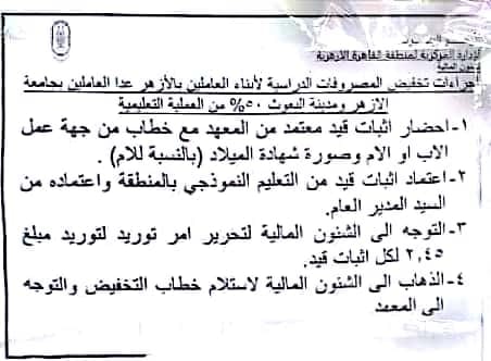 اعلن الازهر الشريف تخفيض المصروفات الدراسية لابناء العاملين بالازهر بنسبة 50 % وفقا للشروط التالية