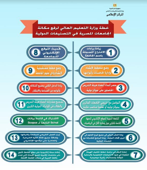 كما شملت الخطوات التنفيذية التي تتخذها الوزارة للارتقاء بمكانة الجامعات الدولية زيادة براءات الاختراع المسجلة باسم الجامعة، والمتابعة الدورية للموقع الإلكتروني للجهة المانحة لجائزتي نوبل وجائزة المجال في الرياضيات، وتحديث الموقع الإلكتروني للجامعة، والاشتراك في قاعدة بيانات Scival التابعة لـ Scopus، وإنشاء مجلة إلكترونية على موقع الجامعة تحتوي على ملخصات إنجليزية لجميع الأبحاث التي تصدر باللغة العربية في مجلات الجامعة المختلفة، وإعادة النظر في دراسة خطط تكليف الهيئة المعاونة في ضوء الاحتياجات التعليمية والبحثية الموثقة بإحصائيات رقمية موضوعية.