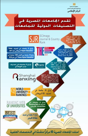 • ارتفع عدد الجامعات المصرية ضمن أفضل 1200 جامعة في تصنيف "Times Higher Education" من 8 جامعات عام 2017 إلى 19 جامعة عام 2019، ومؤخرًا أدرجت 16 جامعة مصرية في التصنيف نفسه لتأثير الجامعات في تحقيق أهداف التنمية المستدامة.