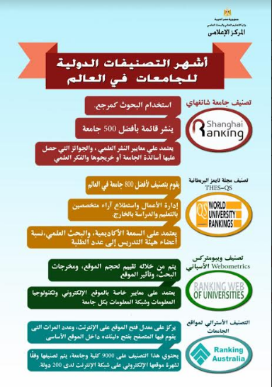 كما أشار التقرير إلى أبرز التصنيفات الدولية للجامعات، منها: تصنيف جامعة شانغهاي Shanghai Jiao Tong University وينشر قائمة بأفضل 500 جامعة، ويعتمد علي معايير النشر العلمي، والجوائز التي حصل عليها أساتذة الجامعة أو خريجوها والفكر العلمي، واستخدام البحوث كمرجع، وكذا تصنيف مجلة تايمز البريطانية THES-QSويقوم بتصنيف لأفضل 800 جامعة في العالم، ويعتمد على السمعة الأكاديمية، والبحث العلمي، بالإضافة إلى نسبة أعضاء هيئة التدريس إلى عدد الطلبة، وإدارة الأعمال واستطلاع آراء متخصصين بالتعليم والدراسة بالخارج، وتصنيف ويبومتركس Webometrics الإسباني ويعتمد على معايير خاصة بالموقع الإلكتروني وتكنولوجيا المعلومات وشبكة المعلومات بكل جامعة، ويتم من خلاله تقييم لحجم الموقع، ومخرجات البحث، وتأثير الموقع، والتصنيف الأسترالي لمواقع الجامعات، وهو تصنيف يركز على معدل فتح الموقع على الإنترنت، وعدد المرات التى يقوم فيها المتصفح بفتح «لينك» داخل الموقع الأساسى، ويحتوي هذا التصنيف على 9000 كلية وجامعة، يتم تصنيفها وفقًا لشهرة موقعها الإلكتروني على شبكة الإنترنت لدى 200 دولة.