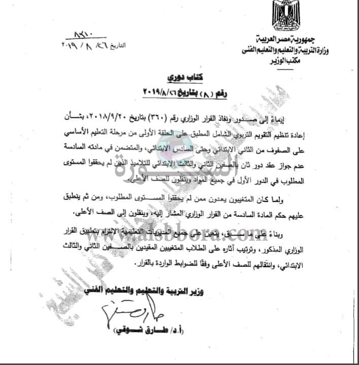 وجاء فى الكتاب الدورى انه ايماء الى صدور ونفاذ القرار الوزارة رقم 360 بتاريخ 20 سبتمبر 2018 بشأن اعادة تنظيم التقويم التربوى الشامل المطبق على الحلقة الاولى من مرحلة التعليم الاساسى على الصفوق من الثانى الابتدائى وحتى السادس الابتدائى والمتضمن فى مادته السادسة عدم جواز عقد دور ثان بالصفين الثانى والثالث الابتدائى للتلاميذ الذين لم يحققو المستوى المطلوب فى الدور الاول فى جميع المواد وينقلون للصف الاعلى.