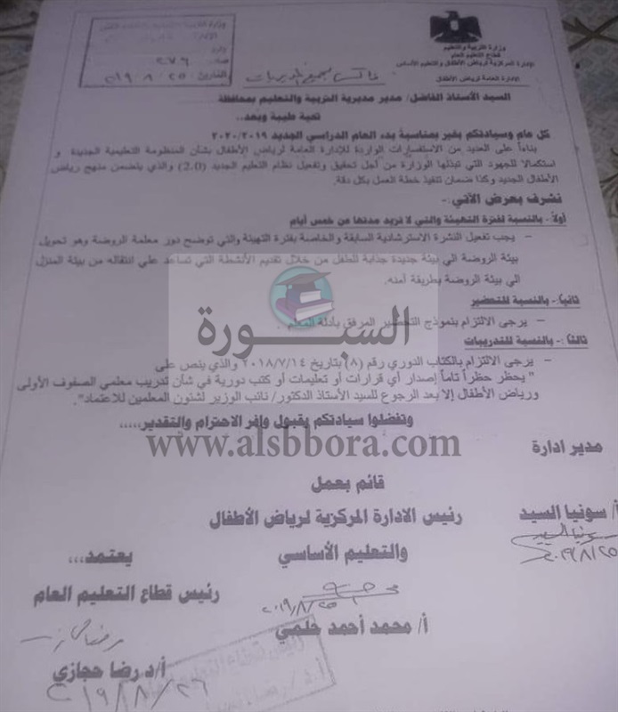ارسلت وزارة التربية والتعليم والتعليم الفنى، فاكسا مهما الى جيمع المديريات التعليمية بشأن فترة التهيئة لمعلمى ومعلمات رياض الاطفال وانتقاله من بيئة المنزل الى بيئة جذابة للطفل من خلال تقديم الانشطة التى تساعده على ذلك.