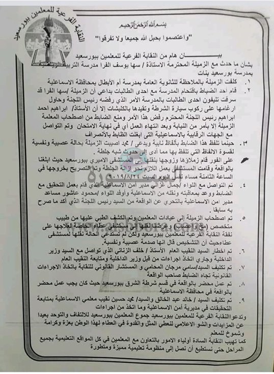 حيث أصدرت نقابة المعلمين الفرعية ببور سعيد بيان حول واقعة اعتداء شرطي علي معلمة التربية الرياضية بمدرسة بورسعيد بنات.