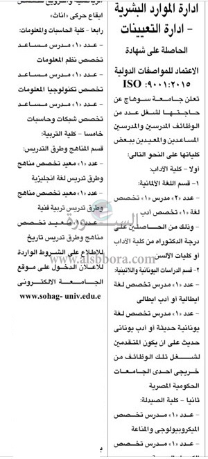 تعلن جامعة سوهاج عن وظائف جديدة لأعضاء هيئة التدريس "من معيد إلي أستاذ" في مختلف الكليات وذلك وفقا لنص الإعلان التالي: