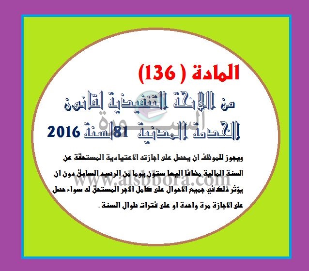 ننشر المادة 136 من اللائحة التنفيذية لقانون الخدمة المدنية بشأن استحقاق الموظف الحصول على اجازته الاعتيادية للسنة المالية مضافا اليها 60 يوما.. مستند