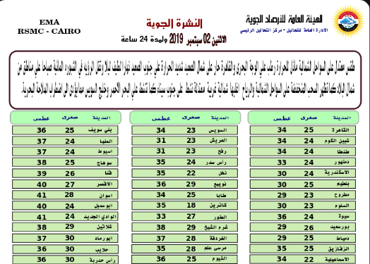 وتقل الرؤية فى الشبورة المائية صباحا على مناطق من شمال البلاد، كما تظهر السحب المنخفضة على السواحل الشمالية والرياح أغلبها شمالية غربية معتدلة تنشط على جنوب سيناء، كما تنشط علي البحر الأحمر وخليج السويس، مما يؤدى إلى اضطراب الملاحة البحرية.