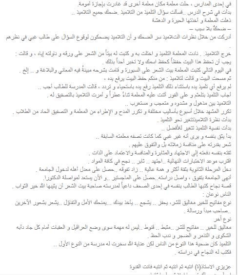 ﻗﺼﺔ ﻧﺠﺎﺡ ﻛﺘﺒﻬﺎ ﺍﻟﻄﺎﻟﺐ ﺑﻨﻔﺴﻪ ﻓﻲ ﺇﺣﺪﻯ ﺍﻟﺼﺤﻒ ﺩﺍﻋﻴﺎً ﻟﻤﺪﺭسته ﺻﺎحبة ﺑﻴﺖ ﺍﻟﺸﻌﺮ ﺃﻥ يثيبها ﺍﻟﻠﻪ ﺧﻴﺮ ﺍﻟﺜﻮﺍﺏ .
