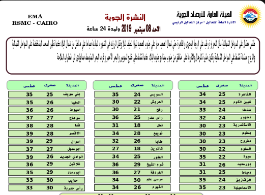 وأكدت الهيئة ظهور السحب المنخفضة على السواحل الشمالية، وأضافت أن الرياح معتدلة تنشط على السواحل الشمالية، تكون مثيرة للرمال والأتربة على مناطق من جنوب سيناء وجنوب البلاد، كما تنشط على خليج السويس والبحر الأحمر وغرب البحر المتوسط مما يؤدى إلى اضطراب حركة الملاحة.