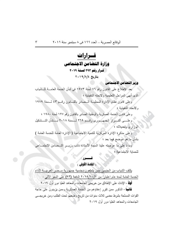 وينص القرار على تكليف الشباب من الجنسين ممن يتمتعون بجنسية جمهورية مصر العربية لأداء الخدمة العامة لمدة عام اعتبارًا من 1 /10 /2019 الدفعة (93) على النحو التالي: