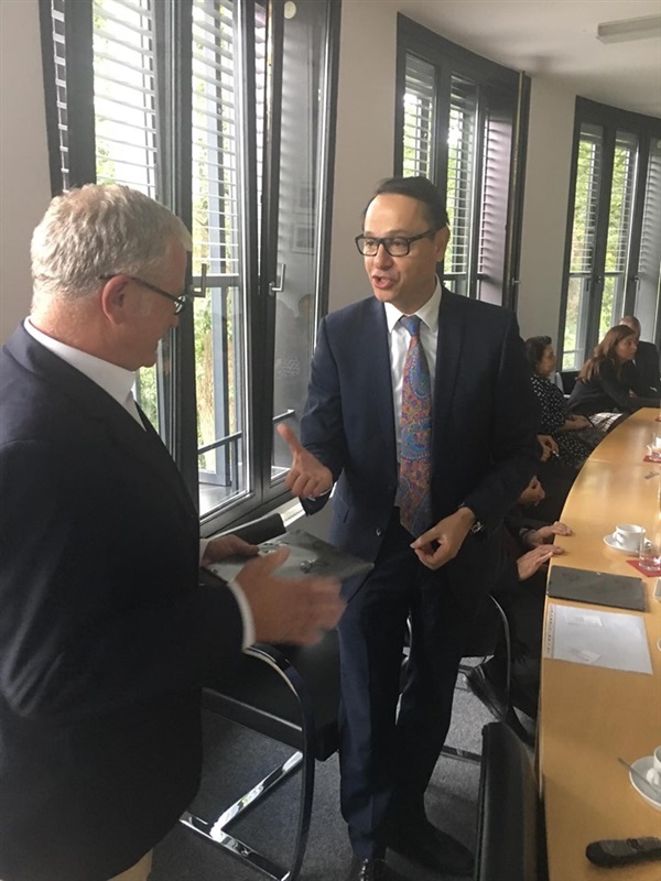 استقبل الدكتور شتيفان بيبر رئيس قسم الشئون الدستورية والقانونية برئاسة الجمهورية الألمانية والمسئول عن مراجعة جميع التشريعات والقرارات الجمهورية وفد المجلس الاستشارى لكلية الحقوق بالجامعة الألمانية بالقاهرة برئاسة الدكتور أشرف منصور، رئيس مجلس أمناء الجامعة، وذلك مقر رئاسة جمهورية ألمانيا الاتحادية.