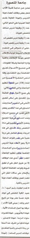 أعلنت جامعة المنصورة عن حاجتها الى اعضاء هيئة التدريس من المعيد الى الاستاذ، وعلى الراغبين فى الحصول على الوظيفة تقديم الطلبات باسم الدكتور عميد الكلية فى موعد غايته 15 يوما من تاريخ نشر الاعلان بجريدة الاهرام يوم السبت الماضى الموافق 7 سبتمبر 2019، على ان يكون آخر موعد للتقديم يوم الاحد الموافق 22 سبتمبر 2019.