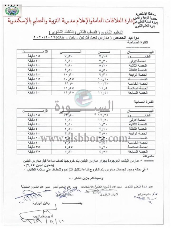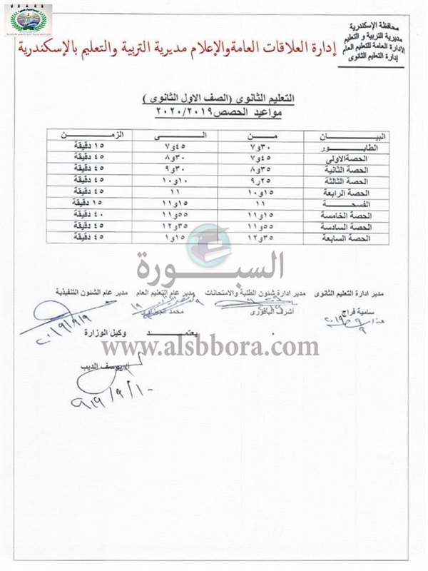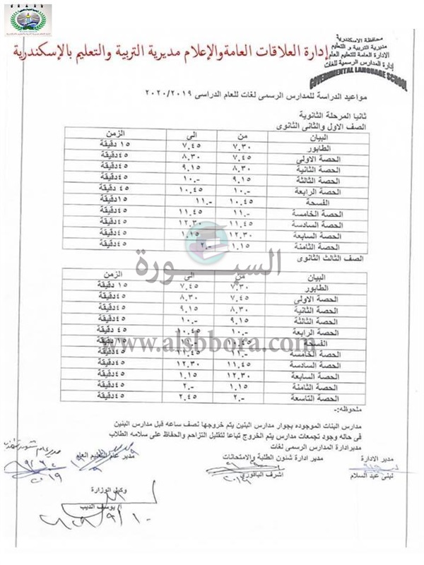 تنشر "السبورة النشرة الرسمية التي أصدرتها وزارة التربية والتعليم والتعليم الفني بمواعيد بدء ونهاية اليوم الدراسى لجميع المراحل ابتدائي - اعدادى - ثانوي نظام جديد اوقديم مدارس الفترة الواحدة والفترتين للعام ٢٠٢٠/٢٠١٩ وقد جاءت المواعيد كالتالي: