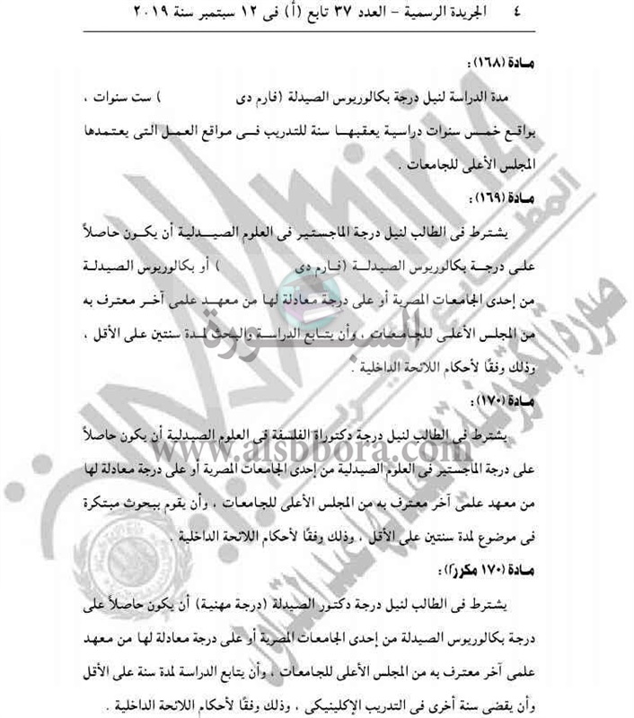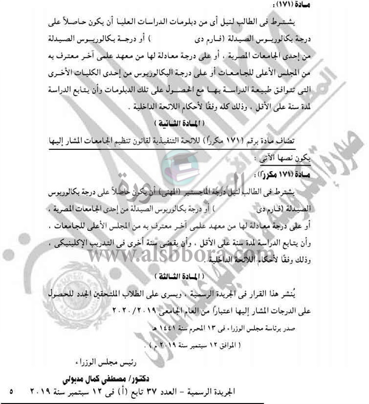 نشر الجريدة الرسمية في عددها 37 بتاريخ 12 سبتمبر 2019 قرار رئيس مجلس الوزراء باعتماد سنوات الدراسة بكلية الصيدلة 6 سنوات بدلا من 5 سنوات.