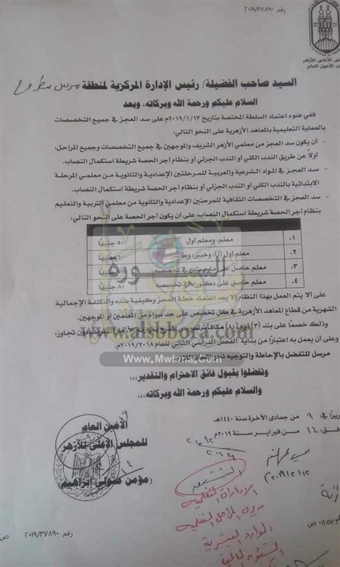 1 ـ سد العجز في المعلمين والموجهين بالأزهر في جميع التخصصات والمراحل يكون عن طريق الندب الداخلي الكلي أو الجزئي أو بنظام الحصة شريطة اكتمال النصاب.