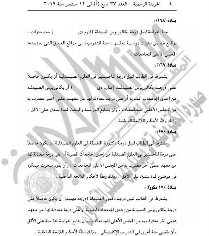 نشر الجريدة الرسمية في عددها 37 بتاريخ 12 سبتمبر 2019 قرار رئيس مجلس الوزراء باعتماد سنوات الدراسة بكلية الصيدلة 6 سنوات بدلا من 5 سنوات و سيتم تطبيق هذا القرار بدءاً من هذا العام ويرتكز النظام الجديد وفق ما جاء ذلك خلال استعراض وزير التعليم العالي والبحث العلمي، تقريرا مفصلا مقدما من الدكتور ماهر الدمياطي رئيس لجنة قطاع الدراسات الصيدلية بالمجلس الأعلى للجامعات ( تشمل اللجنة في عضويتها أكاديميين وخبراء ورجال الصناعة ) بشأن إعادة تنظيم وتحديث البرامج الدراسية المؤهلة لمزاولة مهنة الصيدلة بما يواكب المتطلبات الحديثة للمهنة، والارتقاء بالمستوى التعليمي والمهني لخريجي كليات الصيدلة فى مصر لمواكبة المتطلبات العالمية في الداخل والخارج على ما يلي: