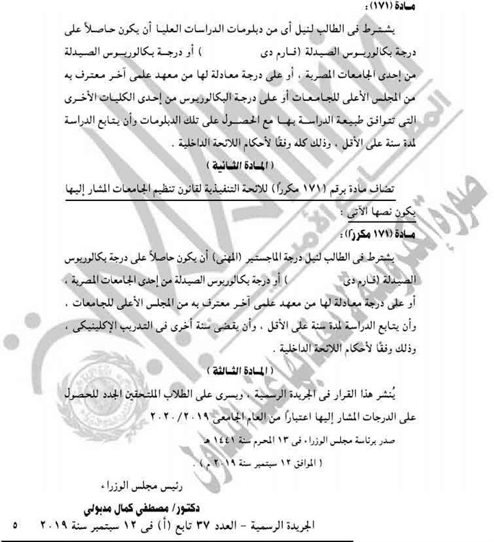 الجريدة الرسمية تنشر قرار مجلس الوزارء بتعديل سنوات الدراسة لكليات الصيدلة