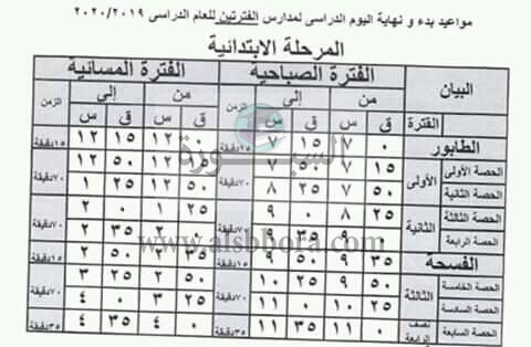 مواعيد بدء ونهاية اليوم الدراسى لمدارس الفترتين 2020/2019