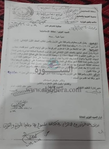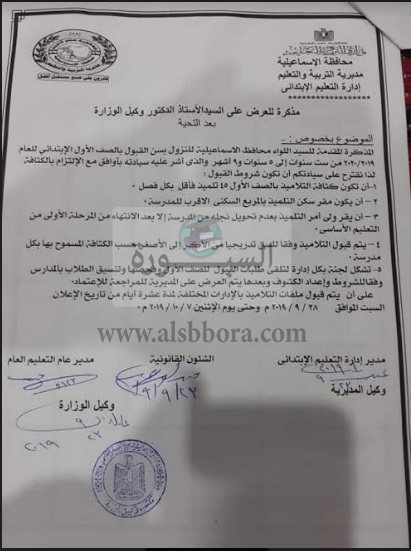 فى إطار حرص تعليم الاسماعيلية علي مصلحة اولياء الامور والطلاب وافق محافظ الاسماعيلية علي النزول بالسن لطلاب الصف الأول الابتدائي الي 5 سنوات و 9 شهور وذلك فى عدد من المدارس التى تسمح الكثافات بها بالإدارات التعليمية المختلفه