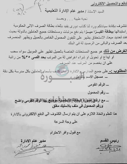 حيث اعلنت زارة التربية والتعليم انه بناءا على الكتاب الدوري الخاص بالغاء بطاقة الصراف الالي الحكومية "فيزا المرتبات" واستبدالها ببطاقة الفيزا "ميزا" يتم دفع مرتبات ومستحقات جميع العاملين بالدولة عند تحديد ميعاد الاستحقاق يظهر على تليفون المحمول الخاص بالعميل ويظهر المنصرف بعد الصرف والباقي من الرصيد في البنك