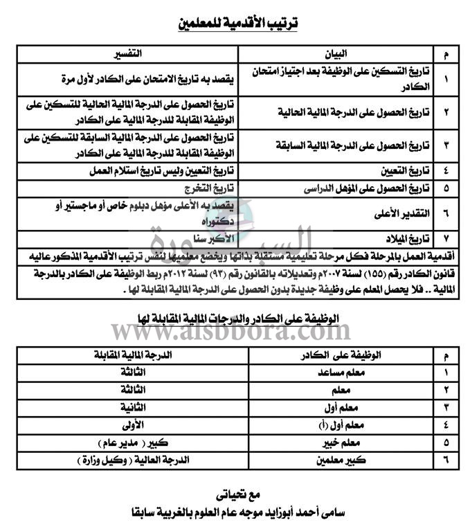 ينشر موقع السبورة جدول ترتيب الاقدمية للمعلمين والدرجات المالية، حيث قام سامى احمد ابو زايد موجه عام بوزارة التربية والتعليم سابقا بنشر الاقدمية الشرح الوافى لها مع الدرجات المالية للكادر.