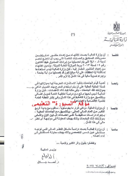اشار جلال في خطابة الي وزارة التعليم العالي تتحمل المالية جزء من تمويل صندوق دعم العاملين بالجامعات وتتحمل الجامعات الجزء الاخر علي ان يتم مراجعة اللائحة التنفيذية في الادارة المركزية للخبرة المالية بقطاع الحسابات والمديريات المالية بعد صدور القانون الخاص بانشاء الصندوق المشار اليه وستقوم وزارة المالية بتدبير الـ 10 % التي يتم تحصيلها من جملة ايرادات الصناديق طبقا للقانون رقم 19 لسنة 2013 بريط الموزانة العامة للدولة للسنة المالية الحالية وذلك من الاحتياجات العامة المدرجة بالموازنة العامة وذلك لاتاحتها للمجلس الاعلي للجامعات