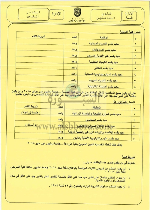تعلن جامعة دمنهور حاجتها الى اعضاء هيئة التدريس من المعيد الى الاستاذ فى 8 كليات، وعلى الراغبين فى الحصول على الوظيفة، حيث يتم قبول الاوراق بناء على الاعداد والشروط المعلنة، والالتزام بما جاء بالاعلان طبقا للقانون.
