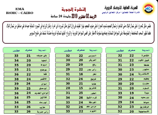 حذر خبراء هيئة الأرصاد الجوية، من طقس اليوم الأربعاء، حيث من المتوقع ان يسود طقس مائل للحرارة على شمال البلاد حتى القاهرة وشمال الصعيد، شديد الحرارة على جنوب الصعيد نهارا لطيف فى أول الليل مائل للبرودة فى آخره.