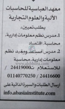 يعلن معهد العباسية للحاسبات الآلية والعلوم التجارية، عن حاجته الى اعضاء هيئة التدريس، وعلى الراغبين فى الحصول على الوظيفة ارسال السيرة الذاتية عبر الايميل المنشور فى جريدة الاهرام، اليوم، الجمعة، 4 اكتوبر 2019.