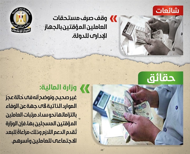كشف مركز المعلومات بمجلس الوزراء عن حقيقة الاخبار المتداولة بشأن وقف صرف مستحقات العاملين بالجهاز الادارى للدولة.