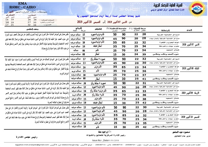 كشف الدكتور إبراهيم عطا، المتحدث باسم الهيئة العامة للإرصاد الجوية، إن درجات الحرارة هذه الأيام تشهد تراجعًا طفيفًا بمعدل درجة إلى درجتين على أغلب الأنحاء لتسجل نحو 29 على السواحل الشمالية، و31 على الوجه البحري والقاهرة وتتراوح بين 34 و39 على مدن ومحافظات الصعيد. وتستمر على هذا النحو حتى نهاية الأسبوع الجاري.