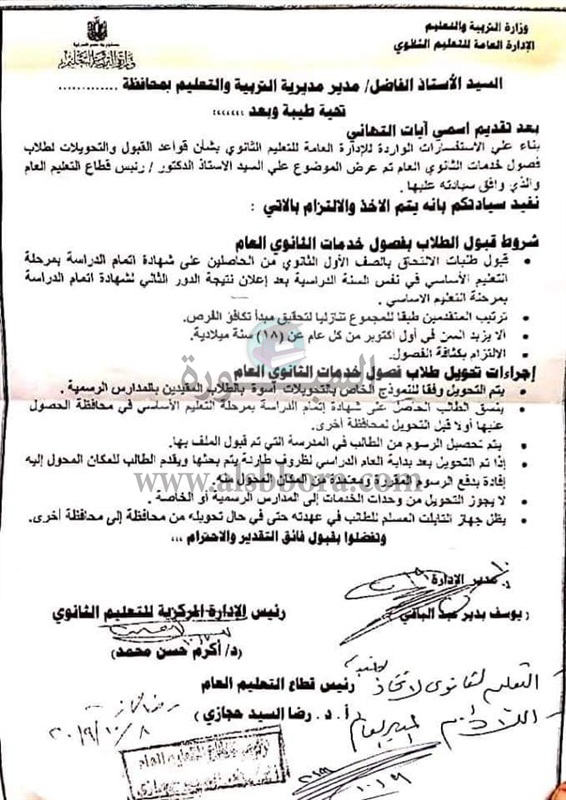 التعليم تعلن شروط قواعد القبول والتحويلات لطلاب فصول الخدمات للثانوي العام.. مستندات