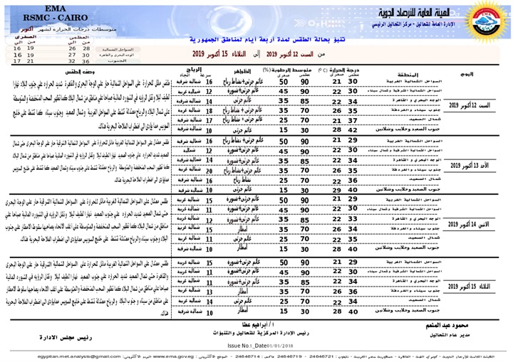 وأكدت الهيئة ظهور السحب المنخفضة والمتوسطة، على أغلب الأنحاء، يصاحبها سقوط أمطار على جنوب البلاد وجنوب سيناء، وأضافت أن الرياح معتدلة تنشط على خليج السويس، مما يؤدى إلى اضطراب الملاحة.