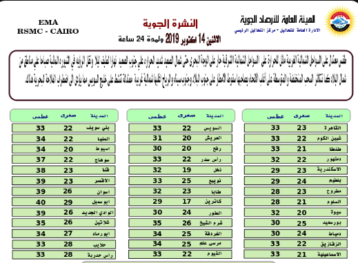 وأكدت الهيئة ظهور السحب المنخفضة والمتوسطة، على أغلب الأنحاء، يصاحبها سقوط أمطار على جنوب البلاد وجنوب سيناء، وأضافت أن الرياح معتدلة تنشط على خليج السويس، مما يؤدى إلى اضطراب الملاحة.