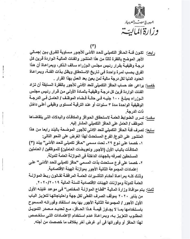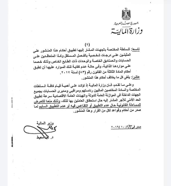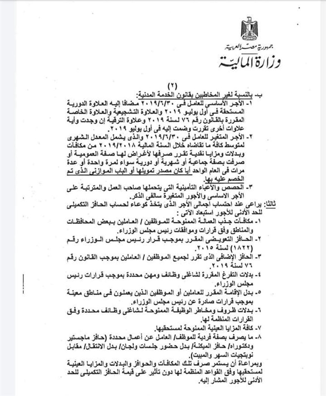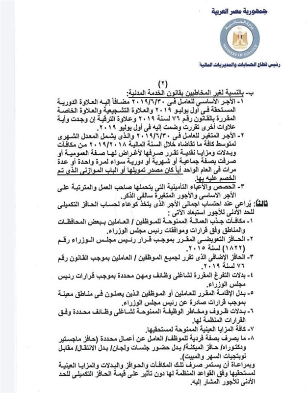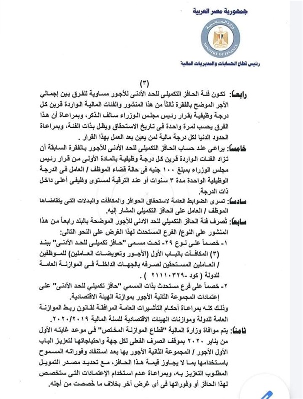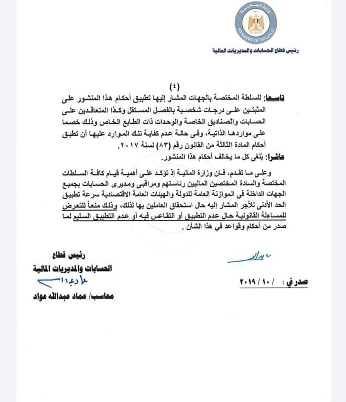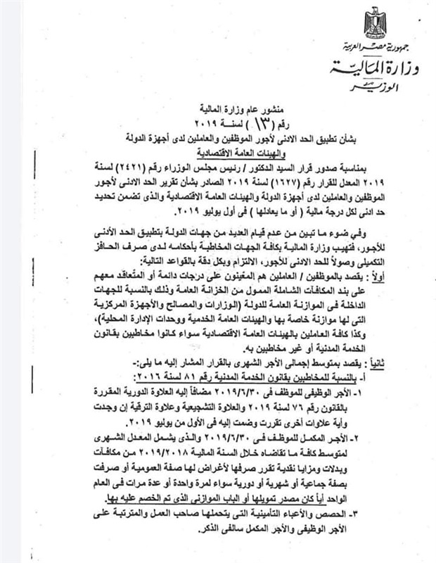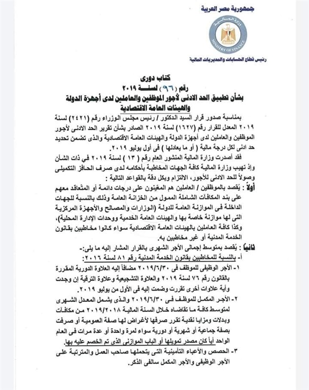 أصدر عماد عواد رئيس قطاع الحسابات والمديريات المالية الكتاب الدوري رقم ٩٦ لسنة ٢٠١٩ بشأن تطبيق الحد الأدنى لأجور الموظفين والعاملين لدي أجهزة الدوله والهيئات العامة الاقتصادية.