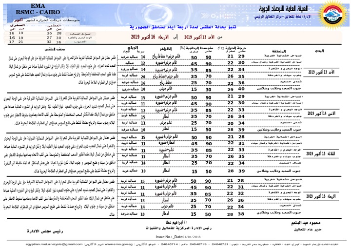 وتقل الرؤية فى الشبورة المائية صباحا على مناطق من شمال البلاد، كما تتكاثر السحب المنخفضة والمتوسطة على أغلب الأنحاء يصاحبها سقوط الأمطار على مناطق من سيناء وخليج السويس وجنوب البلاد وسلاسل جبال البحر الأحمر تكون غزيرة ورعدية أحيانا تصل لحد السيول على بعض المناطق، وقد تمتد خفيفة إلى القاهرة، والرياح أغلبها شمالية غربية معتدلة تنشط على جنوب الصعيد، كما تنشط على خليج السويس مما يؤدى إلى اضطراب الملاحة البحرية هناك.
