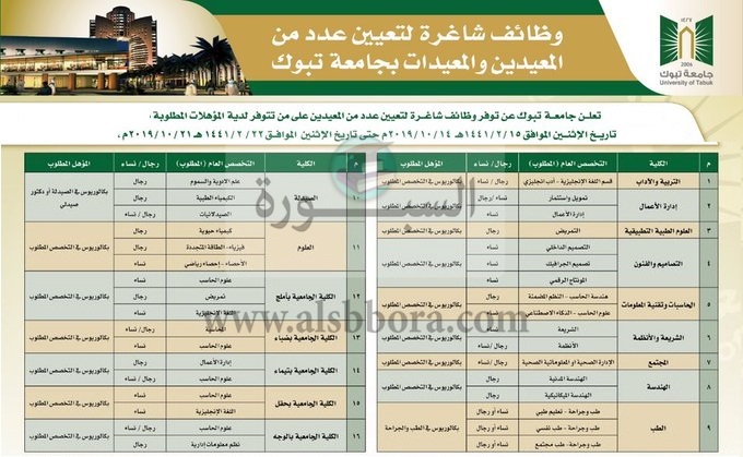 تعلن جامعة تبوك السعودية عن وظائف جديدة لأعضاء هيئة التدريس وذلك وفقا لنص الإعلان التالي:-