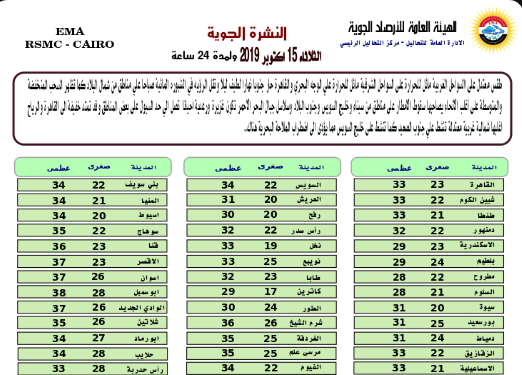 وتقل الرؤية فى الشبورة المائية صباحا على مناطق من شمال البلاد، كما تتكاثر السحب المنخفضة والمتوسطة على أغلب الأنحاء يصاحبها سقوط الأمطار على مناطق من سيناء وخليج السويس وجنوب البلاد وسلاسل جبال البحر الأحمر تكون غزيرة ورعدية أحيانا تصل لحد السيول على بعض المناطق، وقد تمتد خفيفة إلى القاهرة، والرياح أغلبها شمالية غربية معتدلة تنشط على جنوب الصعيد، كما تنشط على خليج السويس مما يؤدى إلى اضطراب الملاحة البحرية هناك.
