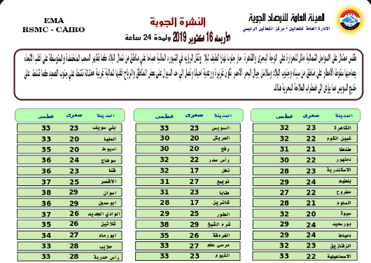 وحذرت الهيئة من الشبورة الصباحية حيث تقل الرؤية صباحا على مناطق من شمال البلاد، كما تظهر السحب المنخفضة والمتوسطة على أغلب الأنحاء يصاحبها سقوط الأمطار على مناطق من سيناء وجنوب البلاد وسلاسل جبال البحر الأحمر تكون غزيرة ورعدية أحيانا وتصل إلى حد السيول على بعض المناطق والرياح أغلبها شمالية غربية معتدلة تنشط على جنوب الصعيد، كما تنشط على خليج السويس ممايؤدى إلى اضطراب الملاحة البحرية هناك.