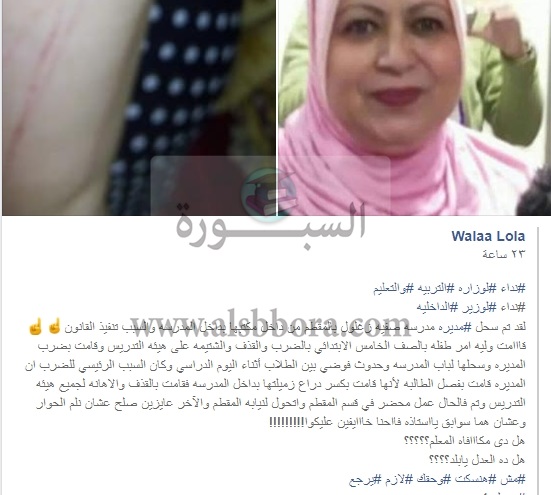 حيث قامت وليه أمر طفله بالصف الخامس الابتدائي بالضرب وشتم هيئه التدريس وقامت بضرب المديره وسحلها لباب المدرسه وحدوث فوضي بين الطلاب أثناء اليوم الدراسي وكان السبب الرئيسي للضرب ان المديره قامت بفصل الطالبه لأنها قامت بكسر دراع زميلتها بداخل المدرسه .