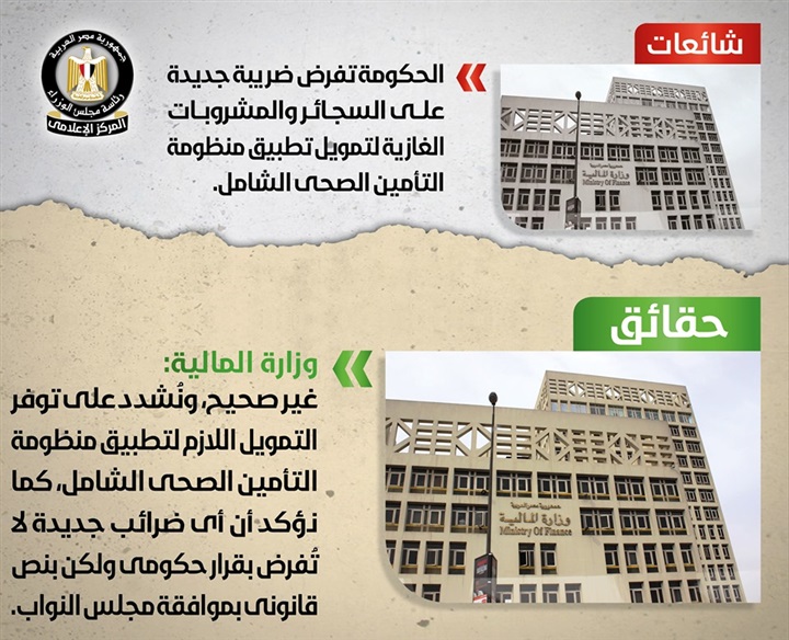 كشف مركز المعلومات بمجلس الوزراء عن الاخبار المتدالة بشأن فرض الحكومة ضرائب جديدة على السجائر والمشروبات الغازية، لتمويل تطبيق منظومة التأمين الصحى الشامل.