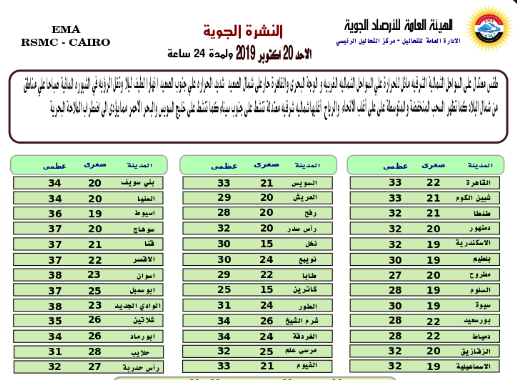 وتقل الرؤية فى الشبورة المائية صباحا على مناطق من شمال البلاد، كما تظهر السحب المنخفضة والمتوسطة على أغلب الأنحاء والرياح أغلبها شمالية شرقية معتدلة تنشط على جنوب سيناء، كما تنشط على خليج السويس والبحر الأحمر مما يؤدى إلى اضطراب الملاحة البحرية.